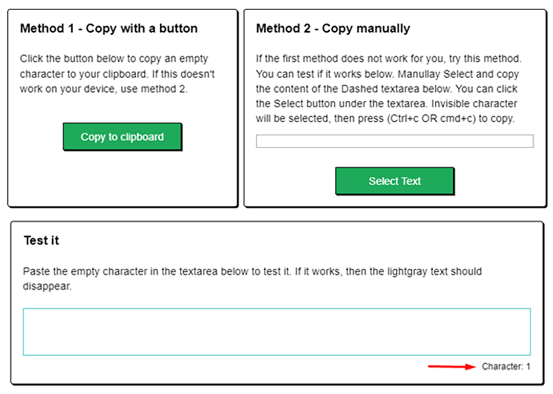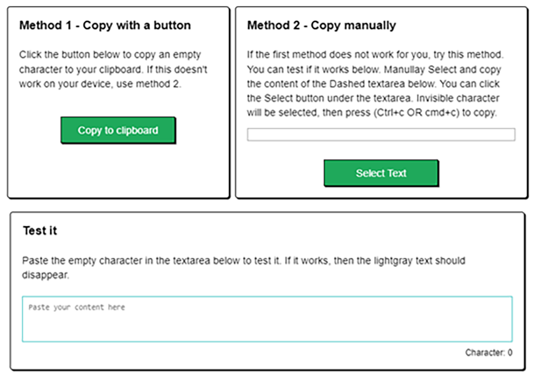 Another method to create invisible characters is to use the empty-text generators. They function the same way as the Unicode generators. However, they may add some more functionality features over the traditional Unicode sites.