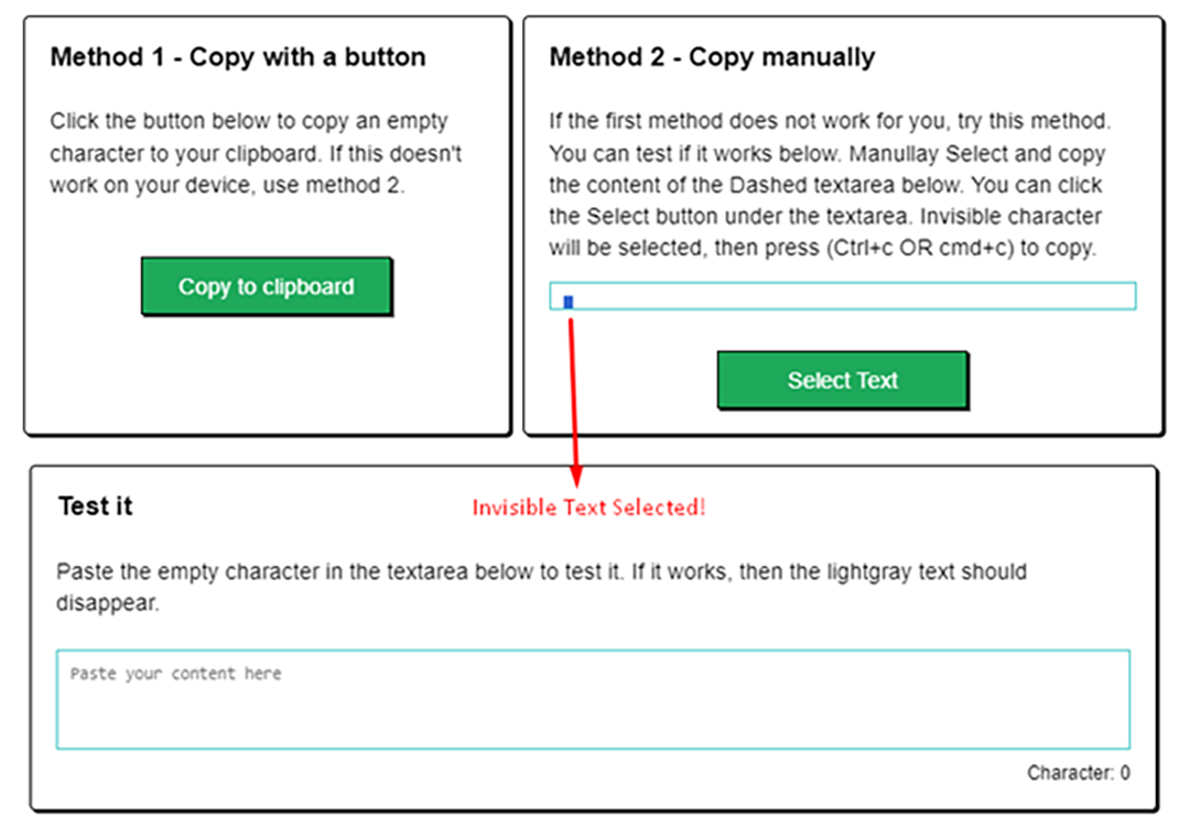 This method is very easy to use. Simply click on the ‘Copy to clipboard’ button, and the tool will automatically copy the invisible characters for you.
